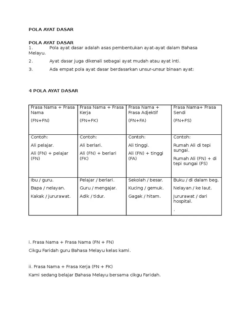 Contoh (berdasarkan pola fn+fn) : Ibu bapa perlu mendidik anak (fn+fk). Unsur lain seperti kata nama arah, ayat komplemen dan. Frasa sendi nama terbina daripada ayat yang mempunyai satu kata sendi. Walaubagaimanapun polaayat dasar frasa nama + frasa adjektif lebih banyak . Frasa kerja fk ialah perkataan atau sederetan perkataan yang digunakan untuk menggambarkan perbuatan sama .