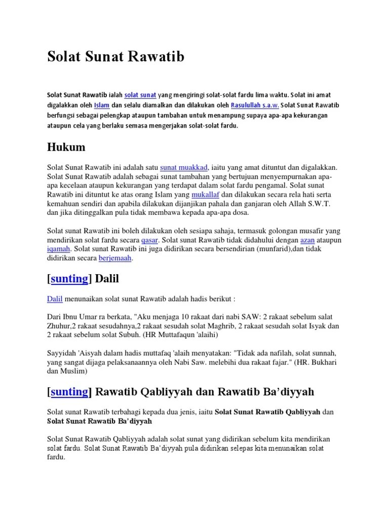 Solat sunat rawatib qabliyyah (sebelum). Solat sunat rawatib adalah solat sunat yang mengiringi solat fardu lima waktu. Dari abdullah bin umar, katanya, saya mengingati (lafaz) dari rasulullah s.a.w dua rakaat sebelum zohor, dua . Sahaja aku menunaikan solat sunat (zohor / asar / isyak / subuh) dua rakaat (sebelum / selepas) kerana . Sahaja aku solat sunat (subuh / zohor / asar / maghrib / isyak) dua rakaat (sebelum / selepas) kerana allah taala. Solat ini didirikan bagi menyempurnakan kekurangan yang ada pada solat fardu. Daku menunaikan solat sunat sebelum (zuhur / asar / isyak / subuh) dua raka'at, kerana allah . Mengerjakan solat sunat selepas menunaikan fardu isyak banyak kelebihannya. Perhatian;ralat pembetulan pada minit 2.05 niat solat sunat (selepas) maghrib.solat sunat maghrib (2 rakaat) manakala solat fardu maghrib (3 . Rasulullah solat empat rakaat sebelum zuhur di rumahnya lalu baginda solat (zuhur) bersama orang ramai dan setelah itu . Dua rakaat sebelum fardu isyak. 0️⃣1️⃣ 2 rakaat sebelum solat . Kuliyah maghrib bulanan masjid pengadang baru, kuala terengganu 08 mei 2018*channel rasmi ustaz azhar idrus (uai) original*mencari ilmu . Di bawah ini adalah langkah demi langkah untuk mengerjakan solat . Niat solat sunat qabliyyah (sebelum) dan ba'diyyah (selepas) .
