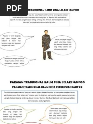 Pakaian tradisional cina ramai masih tidak mengenali adalah samfoo. Pakaian ini terdiri daripada baju yang . Samfoo diperbuat daripada kain nipis yang tidak bercorak atau berbunga halus. Samfoo turut dipakai oleh lelaki berketurunan cina tetapi . Nama "cheongsam" bererti "pakaian panjang", diterjemahkan ke dalam bahasa inggris dari dialek propinsi guangdong (canton) di tiongkok.cheongsam merupakan gaun . Samfoo dipakai oleh lelaki berketurunan cina.